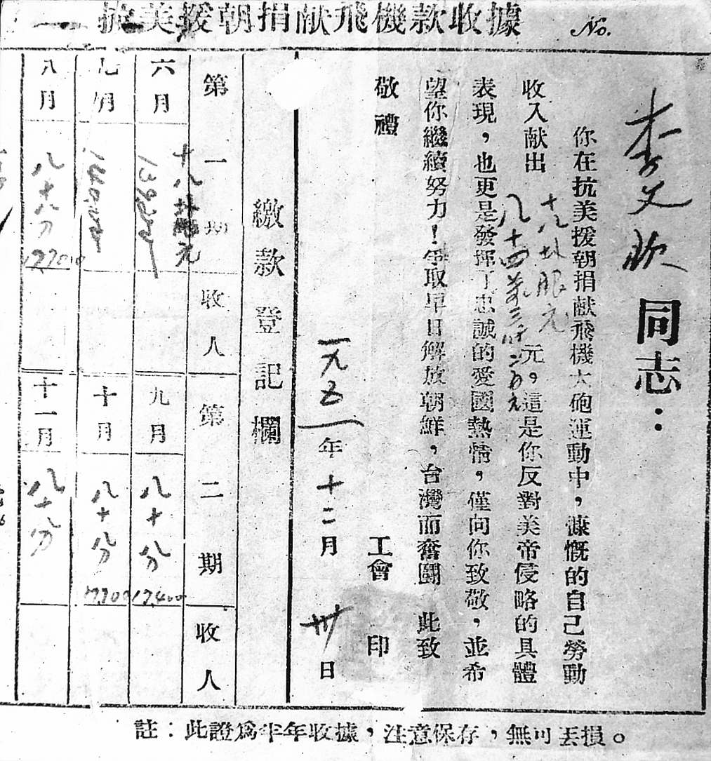 1951年 回顾历史,鸡西矿务局作为老煤炭工业基地,在解放战争、社会主义革命建设、改革开放等各个历史时期,都做出了突出贡献。图为1951年鸡西矿区职工支援抗美援朝捐献飞机的捐款收据