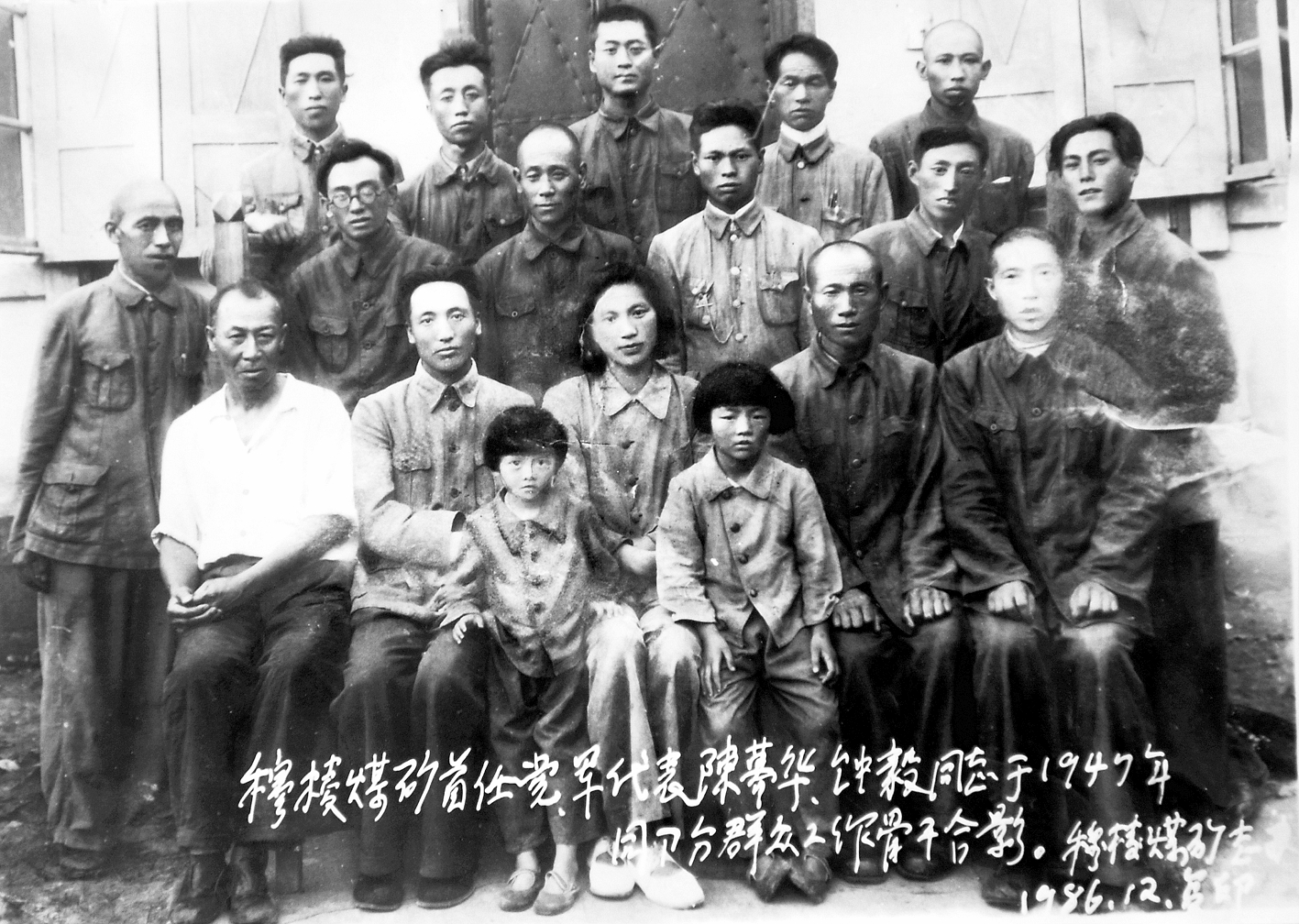 1947年 鸡西矿区建企前的穆棱煤矿首任党、军代表陈慕华、钟毅。离开鸡西后,陈慕华曾任东北铁路局宣传部长、国家计委交通局处长、对外经济联络部部长、国务院副总理、国务委员、中国人民银行行长、全国妇联主任、全国人大副委员长。图为陈慕华(二排左三)与部分群众工作骨干合影