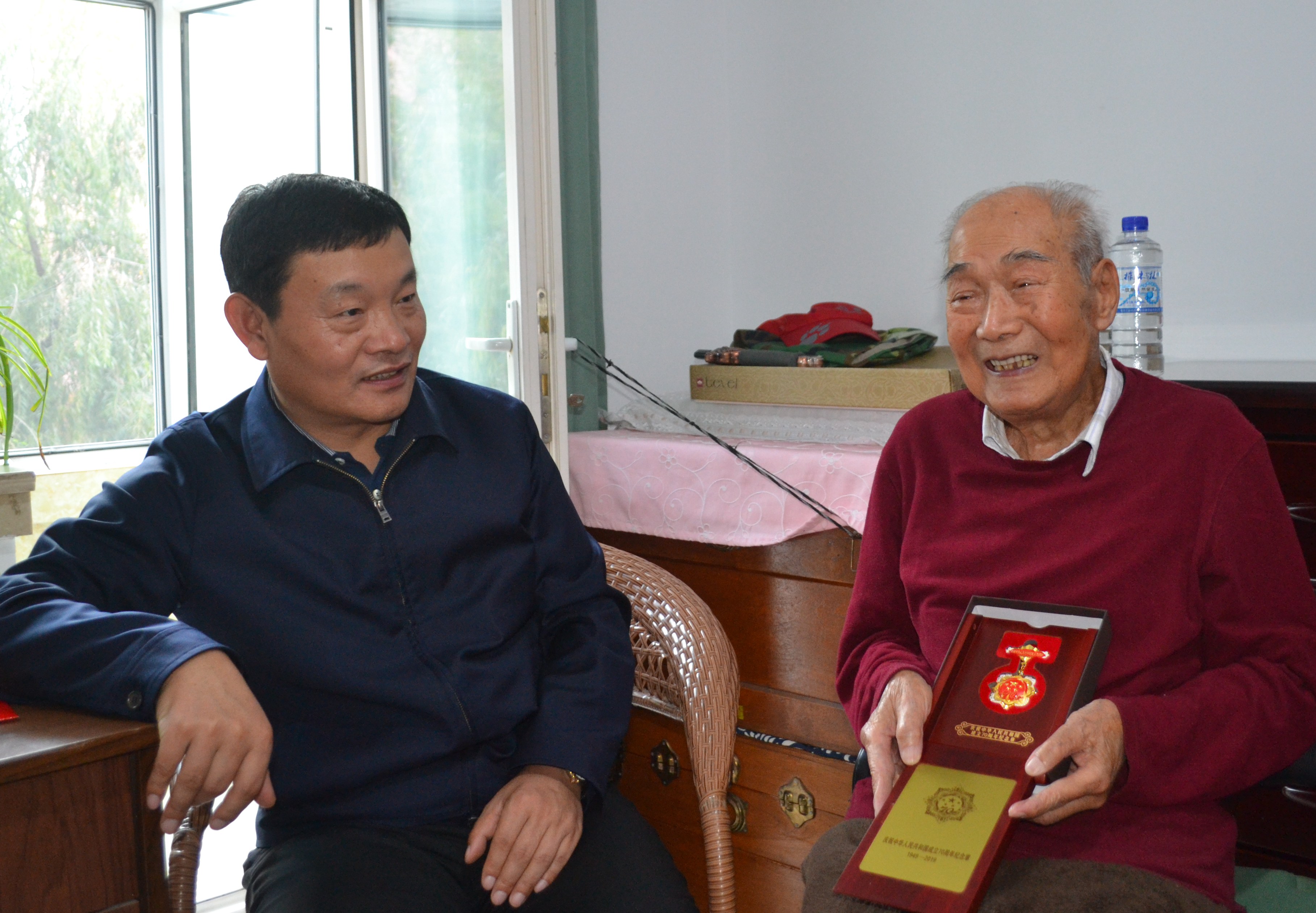王佳喜为张浩明老人颁发了“庆祝中华人民共和国成立70周年”纪念章,并送上了节日慰问金。