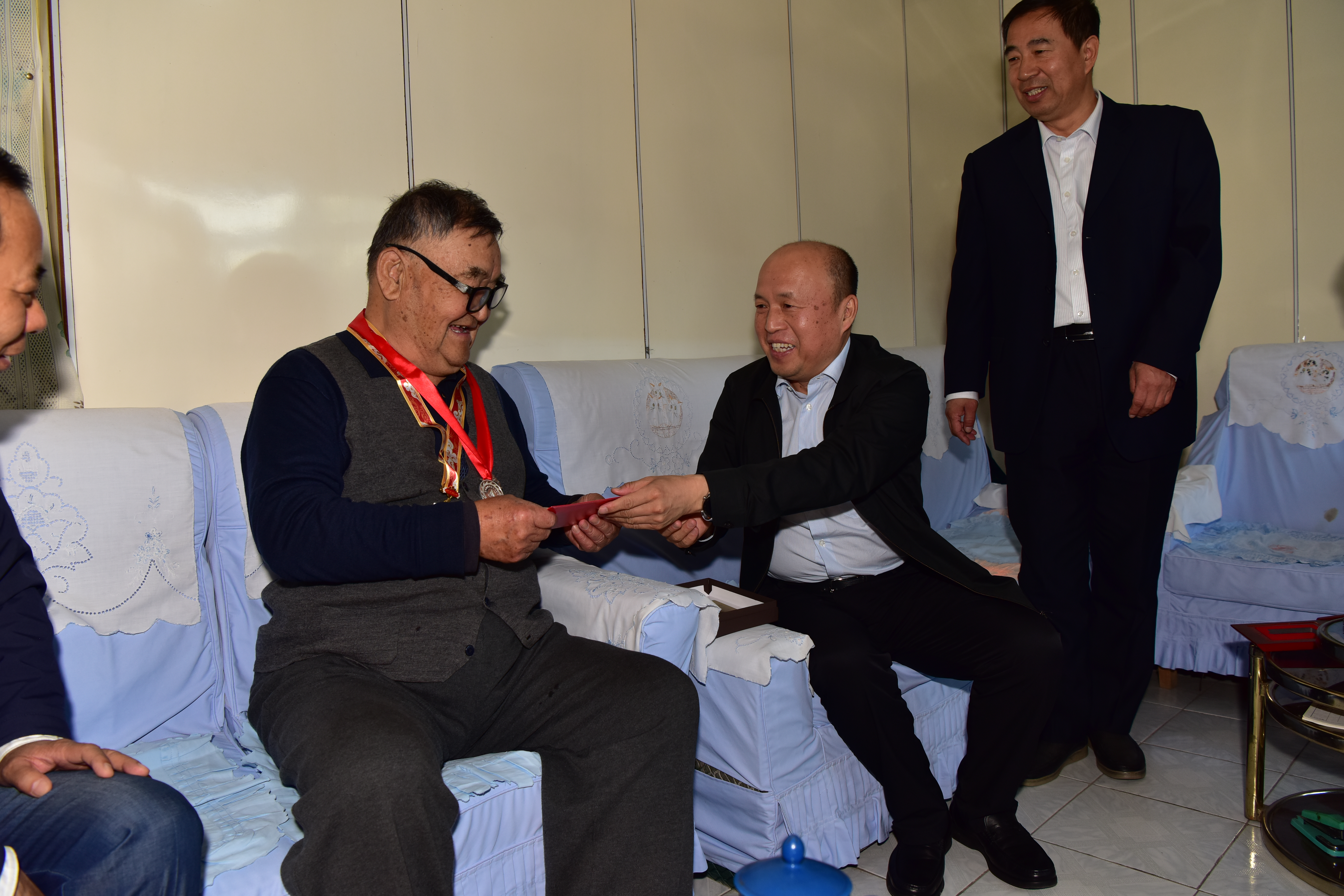 在于嘉民、范玉忠、刘连进、董丹家中,张长山等领导为他们分别颁发了“庆祝中华人民共和国成立七十周年纪念章”和公司颁发的矿区开拓者银质奖章、矿区开拓者奖金,祝他们节日快乐、晚年生活幸福。张长山说:“今年是新中国成立七十周年,我代表七台河公司党委、七台河公司来看望慰问你们,感谢你们为国家建设和企业发展做出的贡献。你们都是建国前参加工作的,把一生最美好的青春、最充沛的精力都奉献给了企业,是企业发展的功臣,企业不会忘记你们的,矿区人民会永远铭记你们,真诚地祝愿你们退休生活丰富多彩、身体健康、阖家欢乐、晚年幸福。