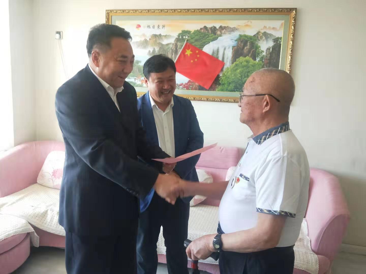 龙煤双鸭山公司党委书记赵生(左一)到原双鸭山矿务局离休老干部李占财同志(右一)家中,为其送纪念章及贺信