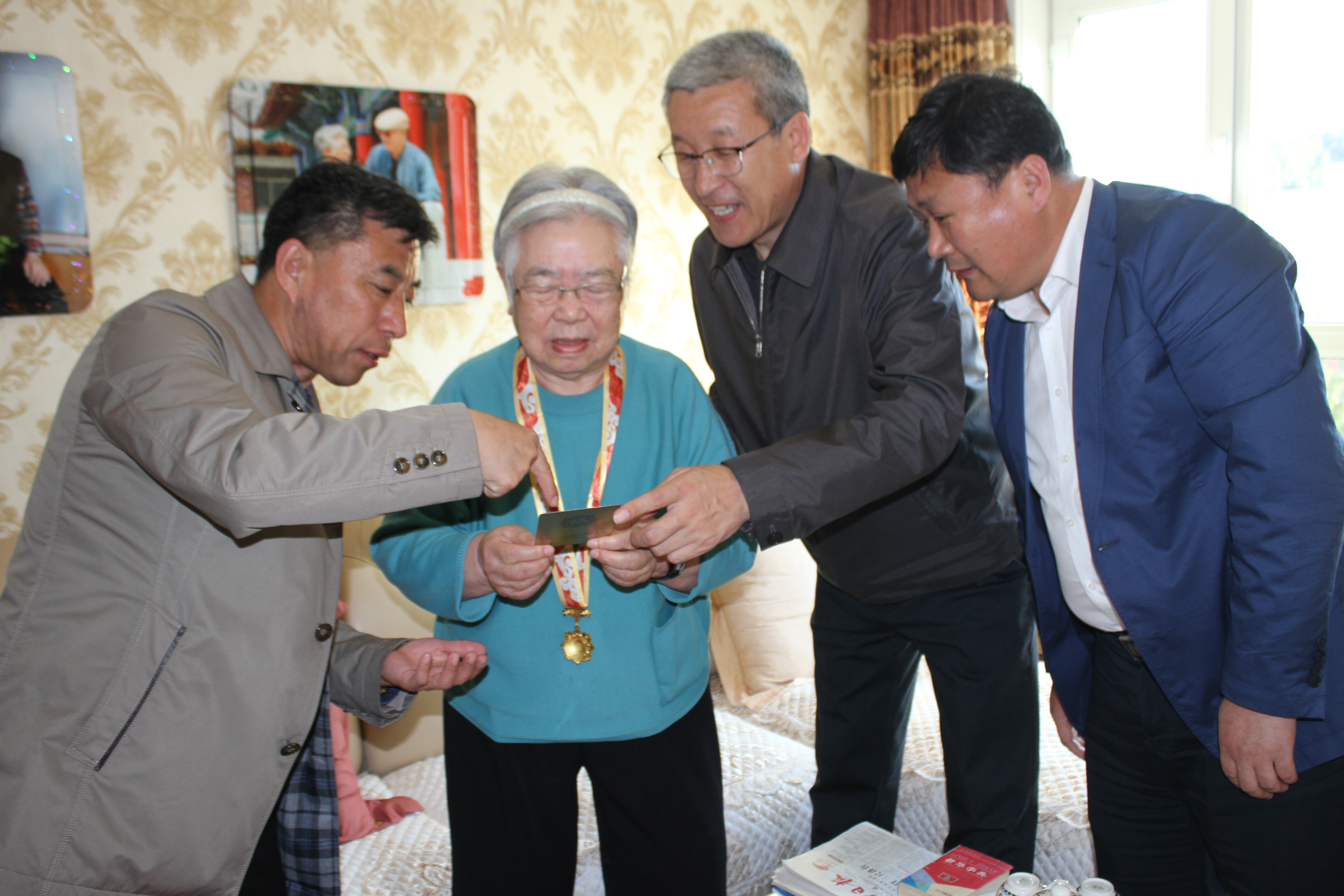 龙煤双鸭山公司党委副书记马琦(右二),党委委员、宣传部部长魏晓东(左一)到原双鸭山矿务局离休老干部张礼礼同志(左二)家中,为其送纪念章及贺信