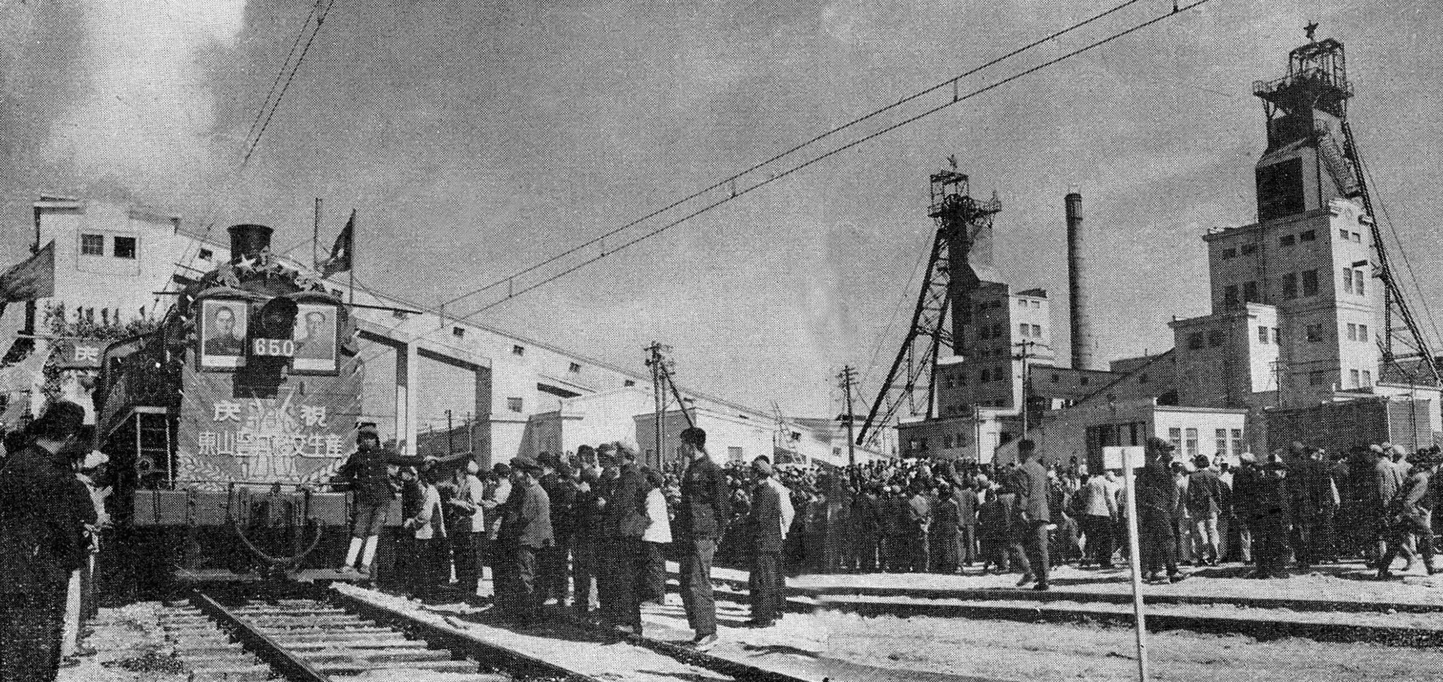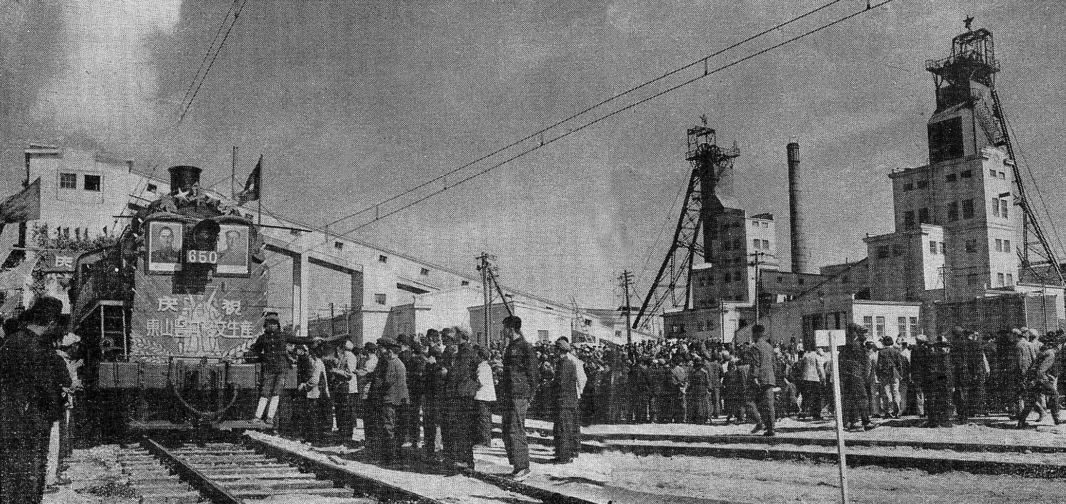 1950年9月20日,由前苏联煤炭工业部矿井设计总局主持,列宁格勒设计院设计的鹤岗东山竖井正式破土动工,历时5年,矿井正式建成并移交投产。由于东山竖井是新中国成立以后建成的第一个竖井,因此被国家煤炭部命名为“新一煤矿”。图为投产后发出第一车煤。