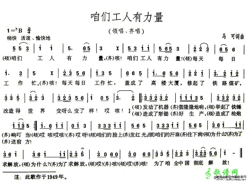 1947年初夏,为迎接新中国的成立,人民音乐家马可先生从延安鲁艺随东北局派遣的慰问团来到东北,筹建东北鲁迅文艺工作团。1949年,马可一起来到鹤岗原中央机械制造厂体验生活,参加工人假日义务劳动。收到工人师傅火热劳动场面的感染,创作出这首富有时代强音的工人歌曲《咱们工人有力量》