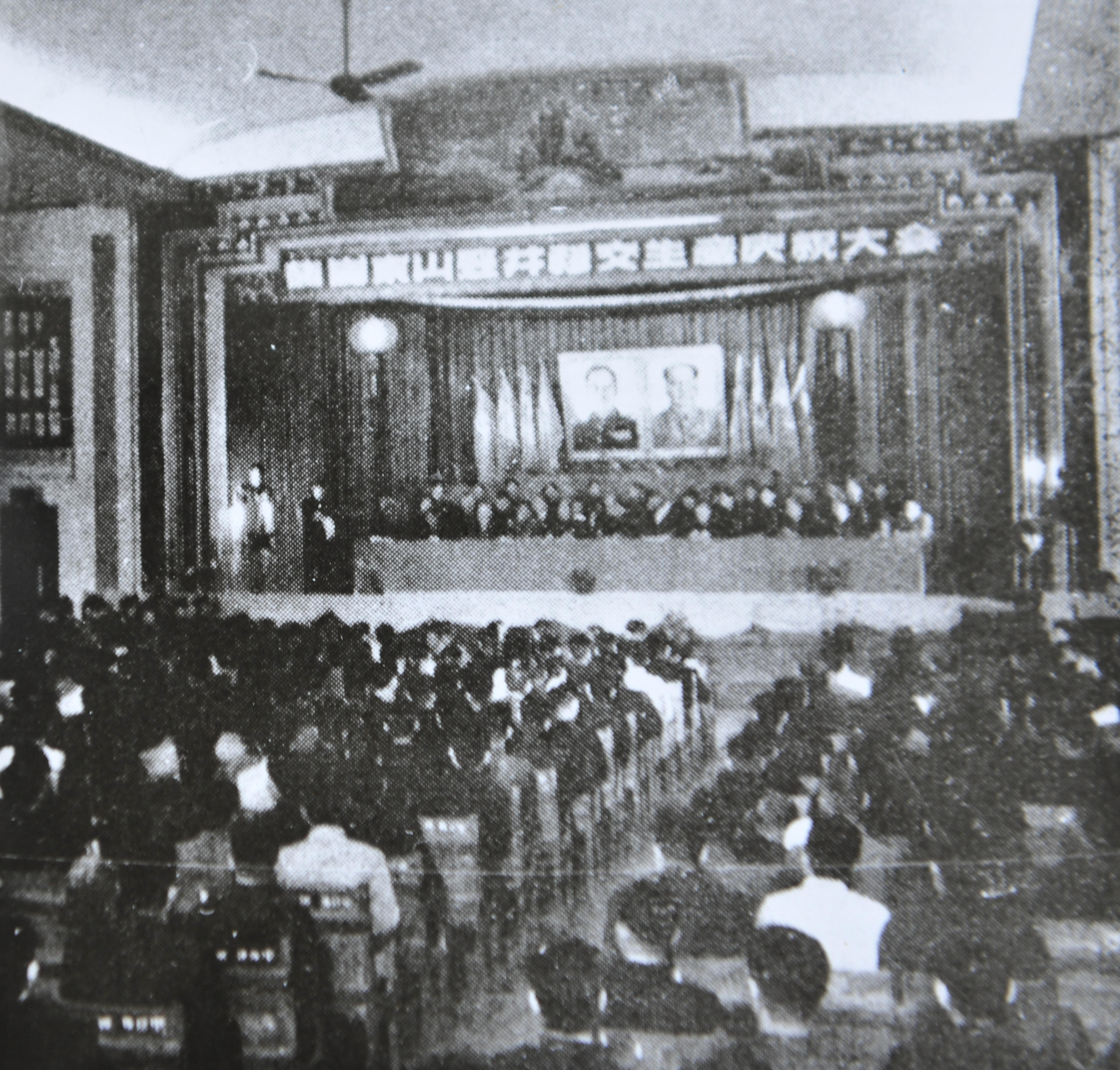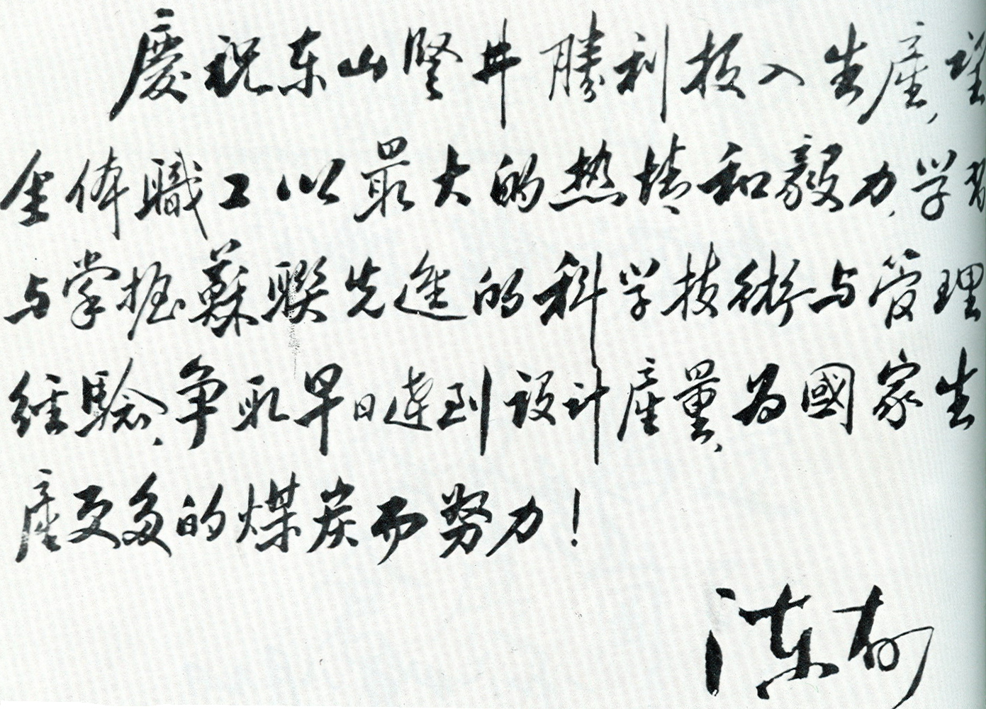 1955年,时任煤炭工业部部长陈郁为鹤岗矿区东山竖井投产题词。