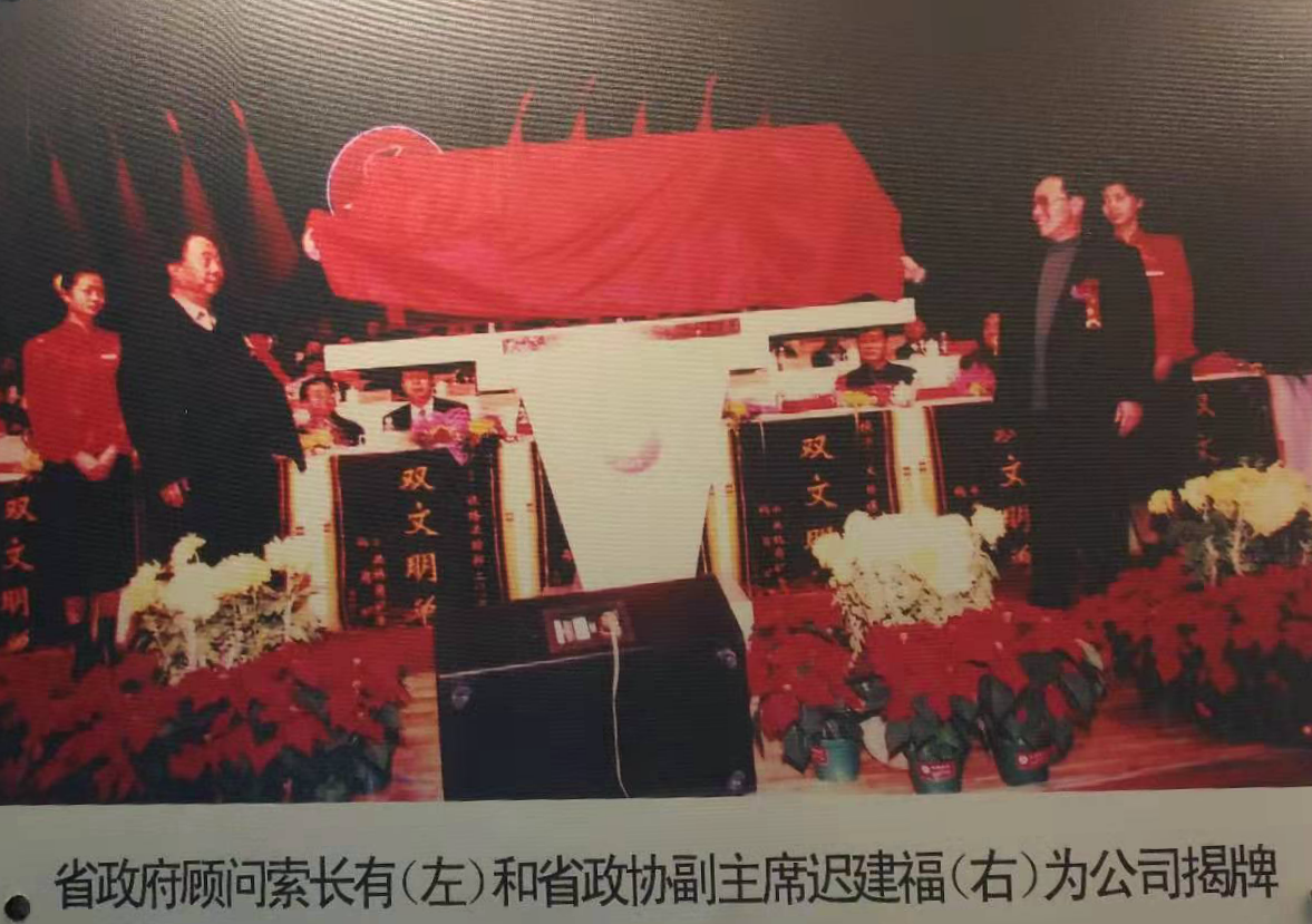 2002年12月18日,鹤岗矿业集团有限责任公司,鹤岗煤矿集团有限公司成立庆典暨双文明建设表彰大会。图为时任黑龙江省政府顾问索长有(左)和省政协副主席迟建福(右)为公司揭牌。