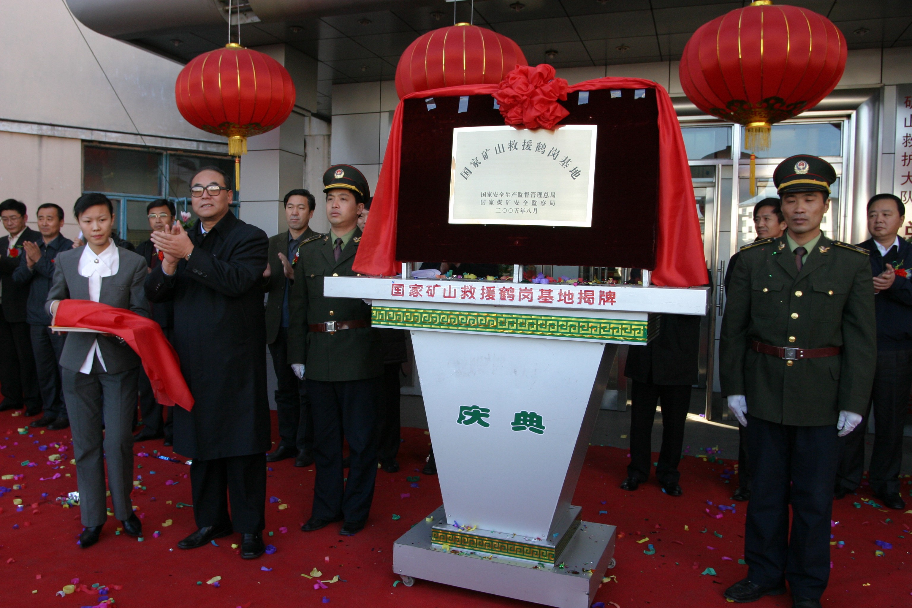 2005年11月10日,中央纪委驻国家安监总局纪检组组长赵岸青(前左二)为国家矿山救援鹤岗基地揭牌。