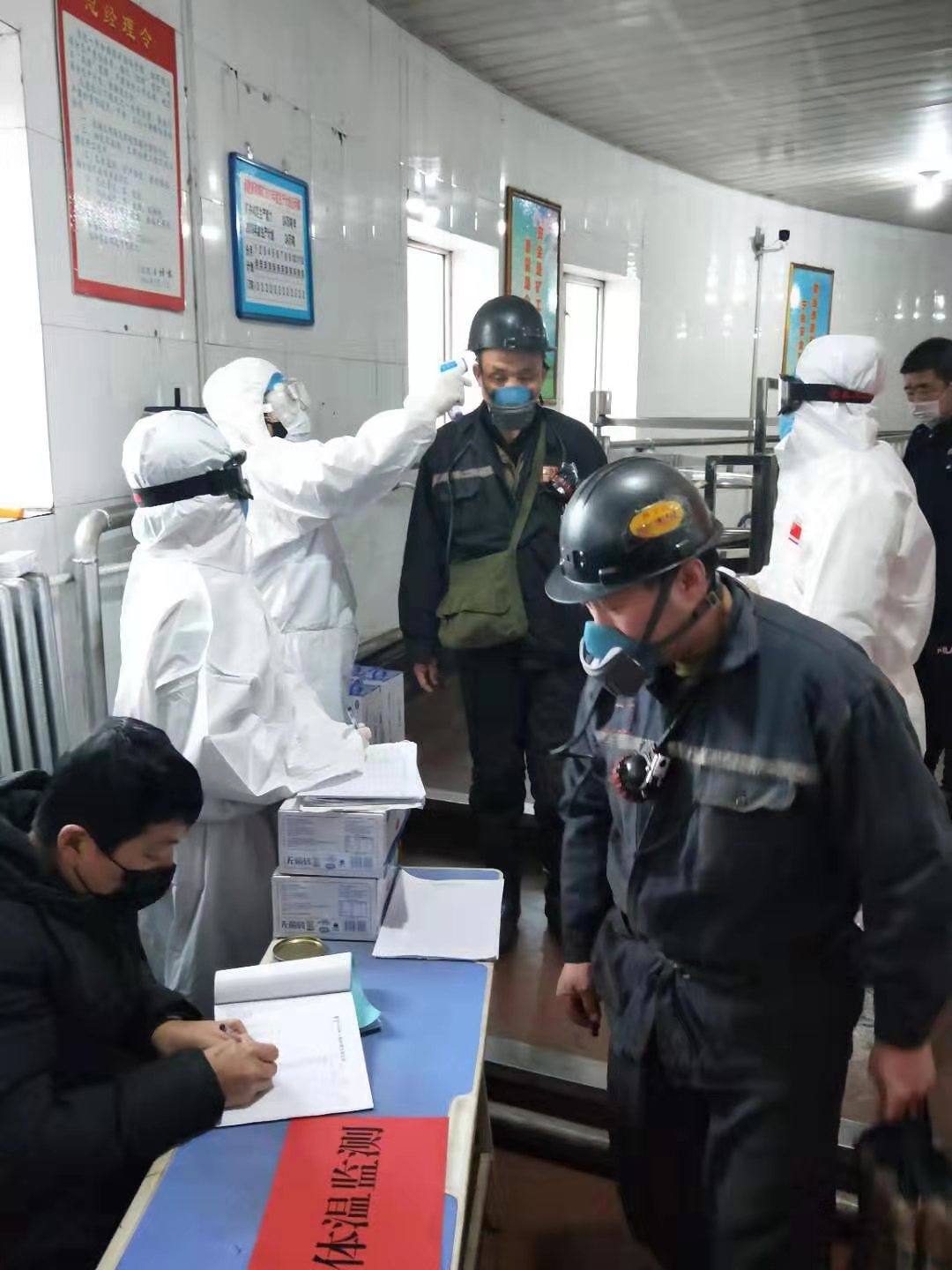 在滴道盛和矿,各卡点工作人员正忙碌着对每一名出勤职工进行体温检测。据了解,今天开工全矿出勤预计将有600多名职工。连日来,这个矿各级干部切实履行疫情防控职责,强化担当、统筹协调、狠抓落实,在完善防疫物资储备、疫情防控措施、复产复工验收等方面,做了大量卓有成效工作。在抓好制定专项应急预案、返岗员工健康情况体检、设立测温点、严格消毒登记、加强用餐、洗浴管理等工作的同时,严格执行复产复工验收制度,配齐满足开工复产要求的特种作业人员;制定并落实复工安全保障措施,严禁隐患不排除和安全措施不落实盲目复工;严格控制入井人数,并要求入井乘罐分批次,井下行走、乘车等间隔1.5米;所有返岗人员建立疫情防控管理档案,实现一人一档管理。