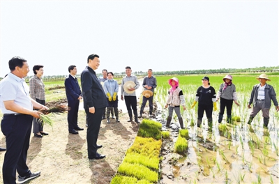 在黄河水滋养下,宁夏平原土地肥沃、物产丰富,素有“塞上江南”之称。9日下午,习近平来到银川市贺兰县稻渔空间乡村生态观光园,听取宁夏现代农业发展、农业合作社带动农民增收致富运营模式等情况汇报,观看宁夏特色农产品展示,了解稻渔种养业融合发展的创新做法。习近平登上观景塔,俯瞰园区全貌。微风轻拂,秧苗摇曳,一派生机勃勃。他沿着田埂走进稻田,同正在劳作的村民们亲切交谈。村民们告诉总书记,现在有土地流转费、劳务费,还有年底分红,收入提高了,也有保障了。正值放鱼时节,习近平舀起鱼苗、蟹苗,放进田边水渠。习近平强调,发展现代特色农业和文化旅游业,必须贯彻以人民为中心的发展思想,突出农民主体地位,把保障农民利益放在第一位。要探索建立更加有效、更加长效的利益联结机制,确保乡亲们持续获益。要注意解决好稻水矛盾,采用节水技术,积极发展节水型、高附加值的种养业,保护好黄河水资源。目前,疫情防控形势稳步向好,要继续抓好常态化疫情防控,加快恢复社会生产生活正常秩序。