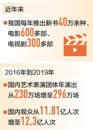 在作品质量提升的同时,我国文化产品的供给能力也在持续增强。目前我国每年推出新书40万余种、童书4万多种、电影600多部、电视剧300多部、动漫400多部……众多文化产品的生产规模位居世界前列。演出市场持续繁荣,2016年到2019年,国内艺术表演团体年演出场次从230万场增长至296万场,国内观众从11.81亿人次增加至12.3亿人次,其中农村观众超过7亿人次。