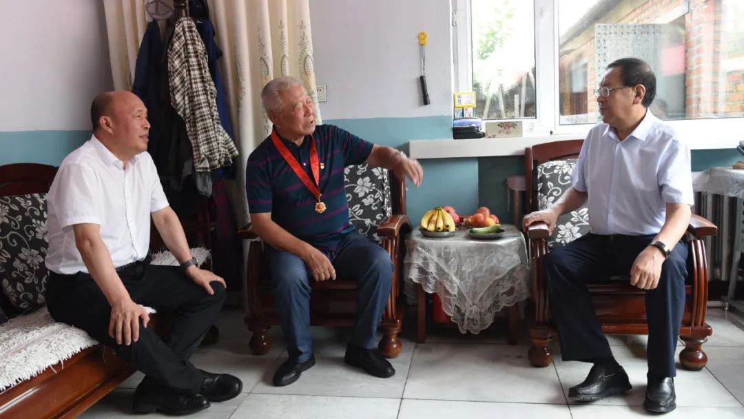 在董占奎家中,沈霆为董占奎佩戴了中共中央颁发的“光荣在党50年”纪念章,关切地询问他的身体状况和日常生活情况,倾听老干部在建设七煤艰苦年代的拼搏奋进史,重温峥嵘岁月,畅谈新时代的发展变化。沈霆说:“在即将迎来建党100周年之际,党中央今年首次颁发‘光荣在党50年’纪念章,充分体现了以习近平同志为核心的党中央对老党员的充分肯定和高度褒奖。我代表集团公司党委、集团公司来看望您,您把一生都奉献给了七煤,为集团公司特别是七煤改革发展、生产建设做出了贡献,企业永远都不会忘记老一辈的丰功伟绩,上级党组织更不会忘记你们。”沈霆希望董占奎继续关注企业发展,发挥晚年余热和党员的先锋模范作用,多为企业发展多提宝贵意见和建议,并祝愿他健康长寿、生活幸福。