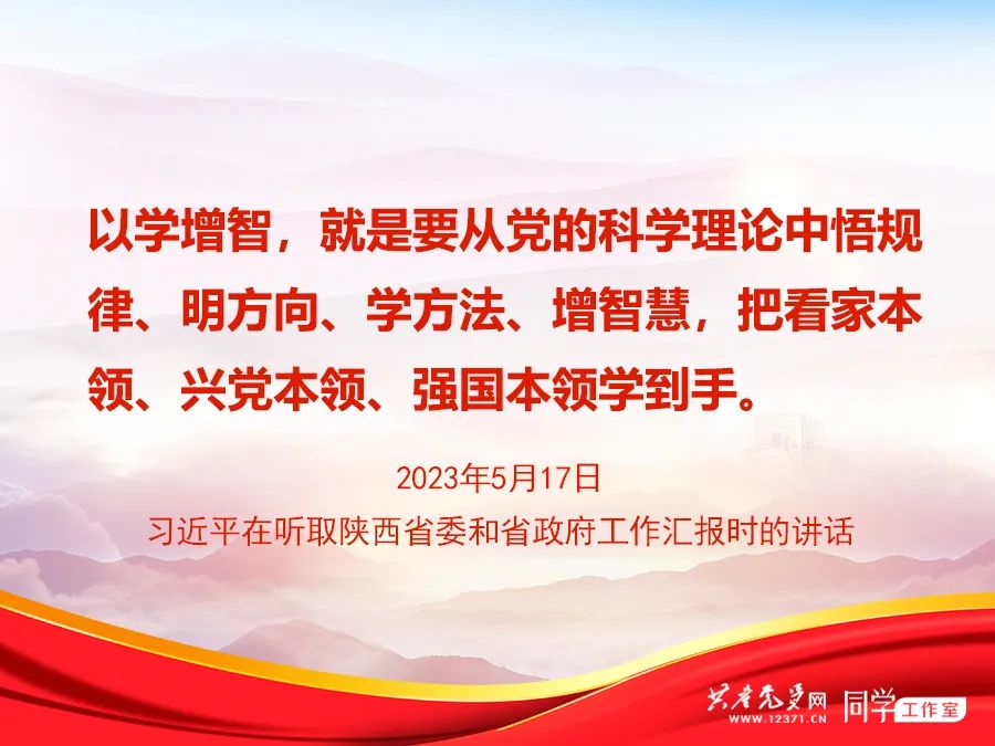 2023年5月17日,习近平总书记在听取陕西省委和省政府工作汇报时指出,学习贯彻新时代中国特色社会主义思想主题教育正在全党深入开展,各级党组织务必在深入、扎实上下功夫,在以学铸魂、以学增智、以学正风、以学促干上见实效。 此次讲话,总书记重点对“以学增智”作了深刻阐述。 总书记指出,以学增智,就是要从党的科学理论中悟规律、明方向、学方法、增智慧,把看家本领、兴党本领、强国本领学到手。 一要提升政治能力,善于从党和人民的立场、党和国家工作大局出发想问题、作决策、办事情,善于从繁杂问题中把握事物的规律性、从苗头问题中发现事物的趋势性、从偶然问题中认识事物的必然性,善于驾驭复杂局面、凝聚社会力量、防范政治风险,切实担负好党和人民赋予的政治责任,真正成为政治上的明白人。 二要提升思维能力,把新时代中国特色社会主义思想的世界观、方法论和贯穿其中的立场观点方法转化为自己的科学思想方法,作为研究问题、解决问题的“总钥匙”,切实提高战略思维、辩证思维、系统思维、创新思维、历史思维、法治思维、底线思维能力,做到善于把握事物本质、把握发展规律、把握工作关键、把握政策尺度,增强工作科学性、预见性、主动性、创造性。 三要提升实践能力,发扬理论联系实际的优良学风,全面把握新时代中国特色社会主义思想一系列新理念新思想新战略的实践要求,增强推动高质量发展、服务群众、防范化解风险本领,加强斗争精神和斗争本领养成,着力增强防风险、迎挑战、抗打压能力,及时填知识空白、补素质短板、强能力弱项,不断提高专业化水平。