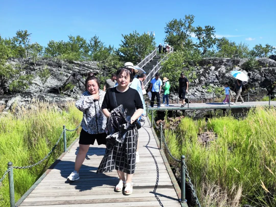在景区,疗休养人员赞叹着火山熔岩的独特和壮观场景,感叹着熔岩上披着的地衣苔藓的顽强生命力,欣赏着林间盛开的五彩花朵的芬芳,感受着林间绿叶的苍翠,观赏着湖面清澈如镜的无比活力。