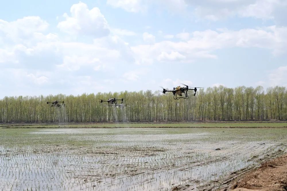 2023年5月,北大荒集团军川农场有限公司正使用植保无人机对刚刚插秧的地块喷施液态返青肥。