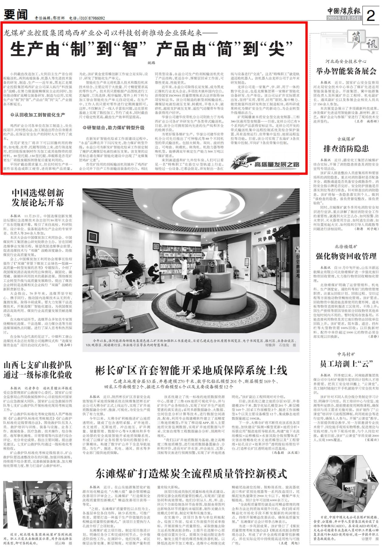 11月25日,《中国煤炭报》对鸡西矿业公司推动煤矿高精尖装备研发制造与应用进行报道。