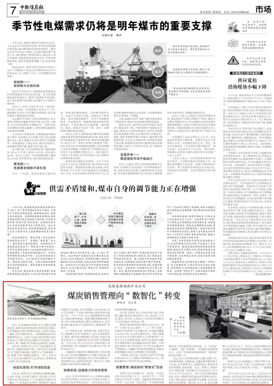 鸡西矿业公司的数字化、自动化、信息化系统不仅应用到了井下,也送到了井上,不仅活跃在生产的各个流程,也融进经营管理的每个环节。该公司将“信息共享”作为煤炭智慧储运销工作的重要途径和举措,以“信息流”“大数据”支撑“指挥链”,有效提升经营管理水平,迈出了传统煤炭销售管理向“数智化”转变的关键一步。