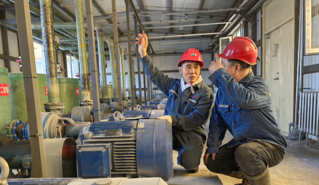 杨会军(左)在调研矿井水治理。 耿闻 摄