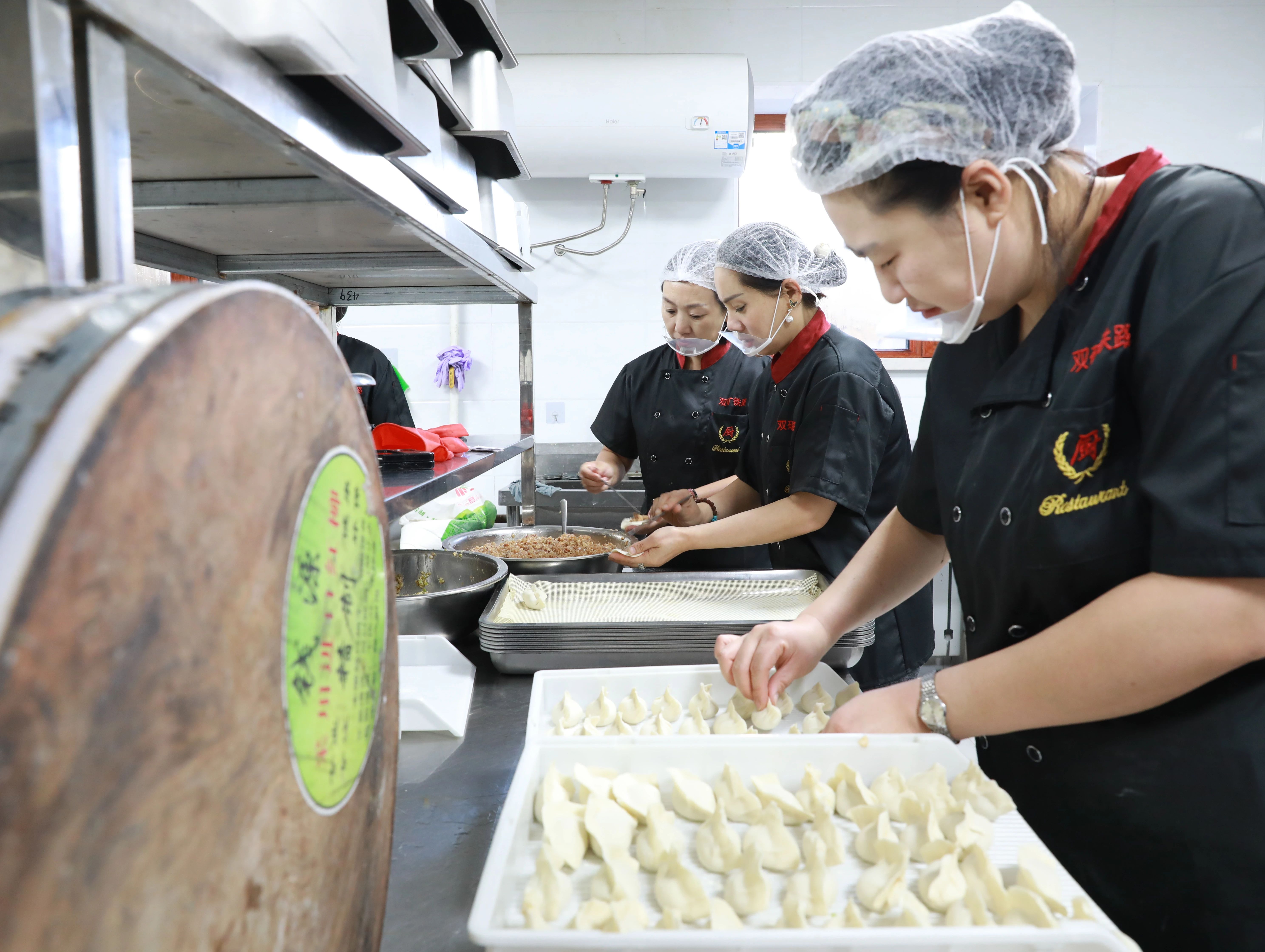 “饺子皮边缘抹点水。”“将中间对折合拢,再捏紧两边。”“馅料不要太多,不然就露馅啦。”铁路运输部职工在食堂内忙得热火朝天。