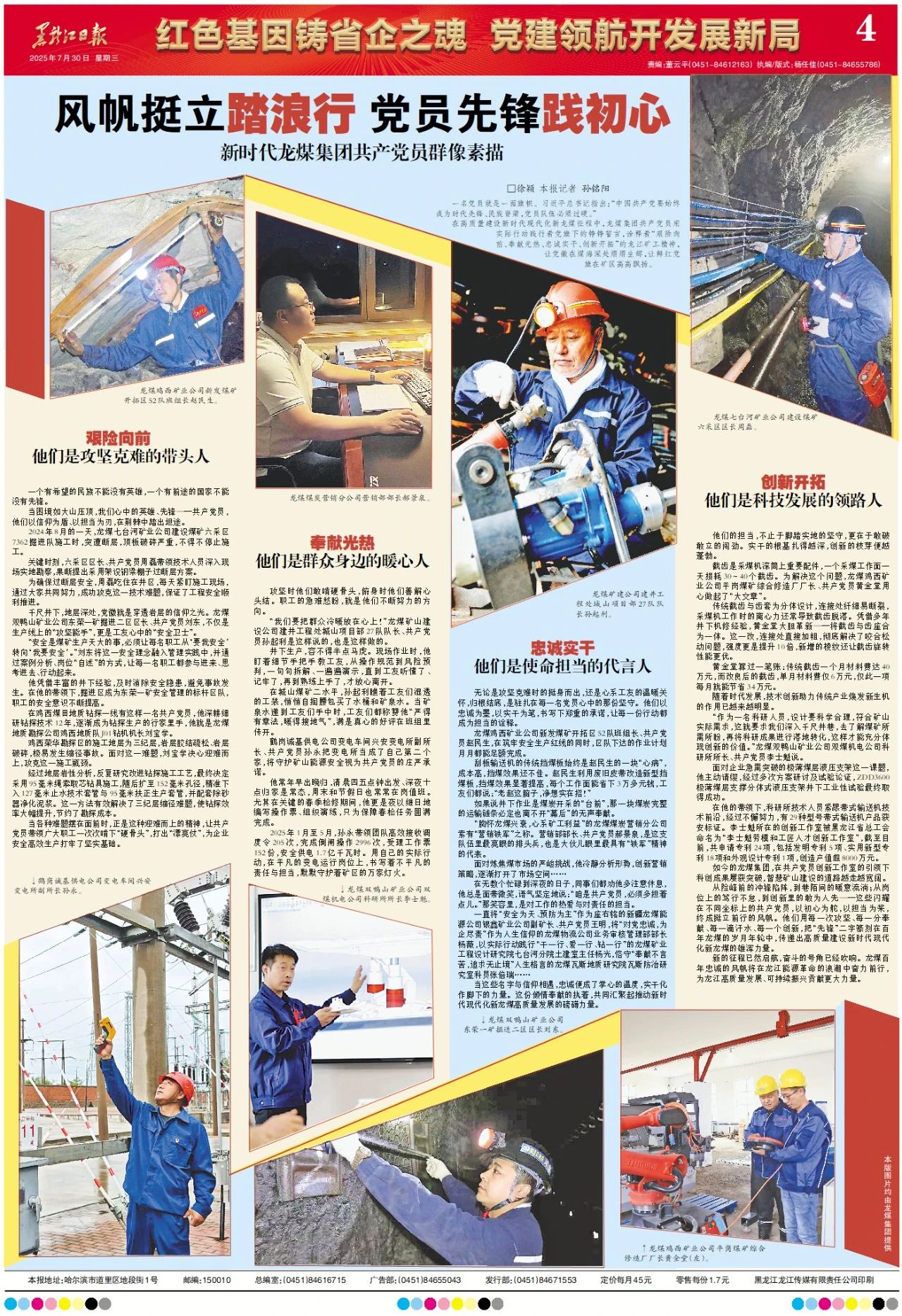 从险峰前的冲锋陷阵,到巷陌间的暖意流淌;从岗位上的笃行不怠,到创新里的敢为人先——这些闪耀在不同坐标上的共产党员,以初心为舵,以担当为桨,终成挺立前行的风帆。他们用每一次攻坚、每一分奉献、每一滴汗水、每一个创新,把“先锋”二字篆刻在百年龙煤的岁月年轮中,传递出高质量建设新时代现代化新龙煤的雄浑力量。