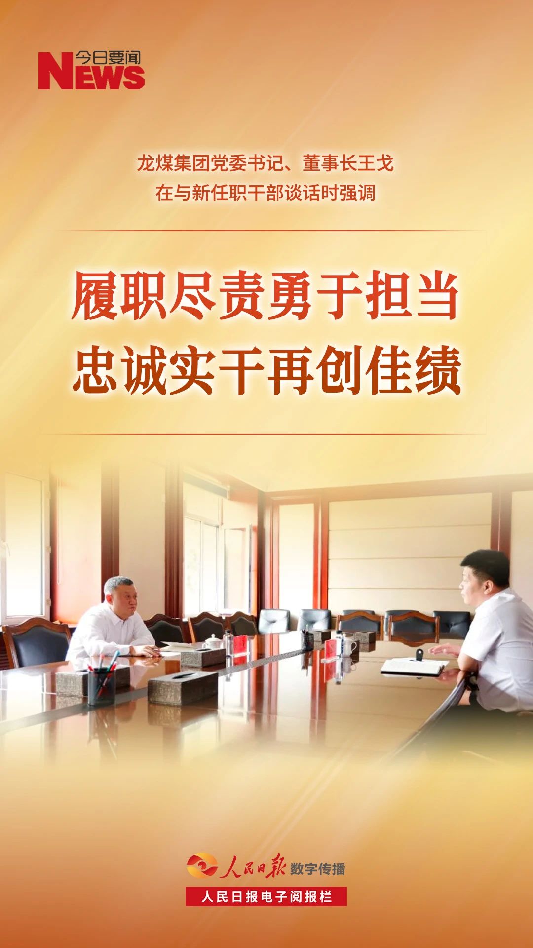 按照《中共黑龙江省委关于加强对“一把手”和领导班子监督的工作措施》要求,8月17日上午,龙煤集团党委书记、董事长王戈对新任职干部,鸡西矿业公司党委副书记、副董事长、总经理宁忠伟开展谈心谈话,鼓励新任职干部要持续深入学习贯彻习近平新时代中国特色社会主义思想,深入学习贯彻习近平总书记在我省考察时的重要讲话精神,努力在新的工作岗位上展现新风貌、创造新成就,不辜负组织的重托和广大矿区职工群众的殷切期望,为高质量建设新时代现代化新龙煤贡献新的力量。