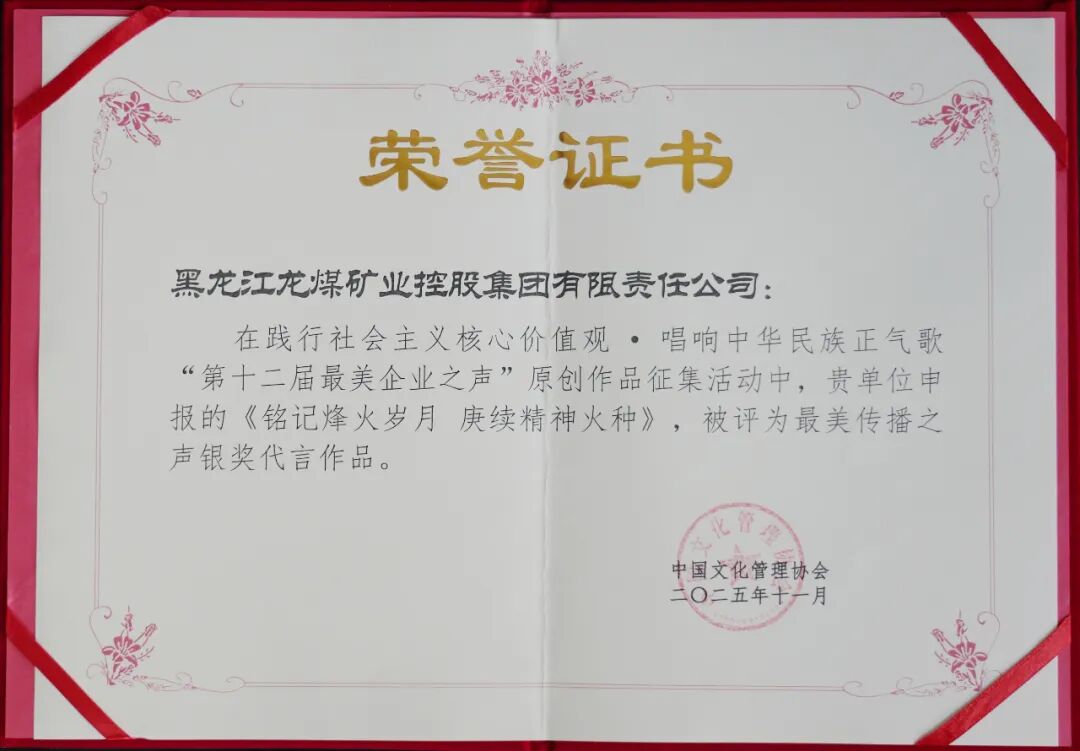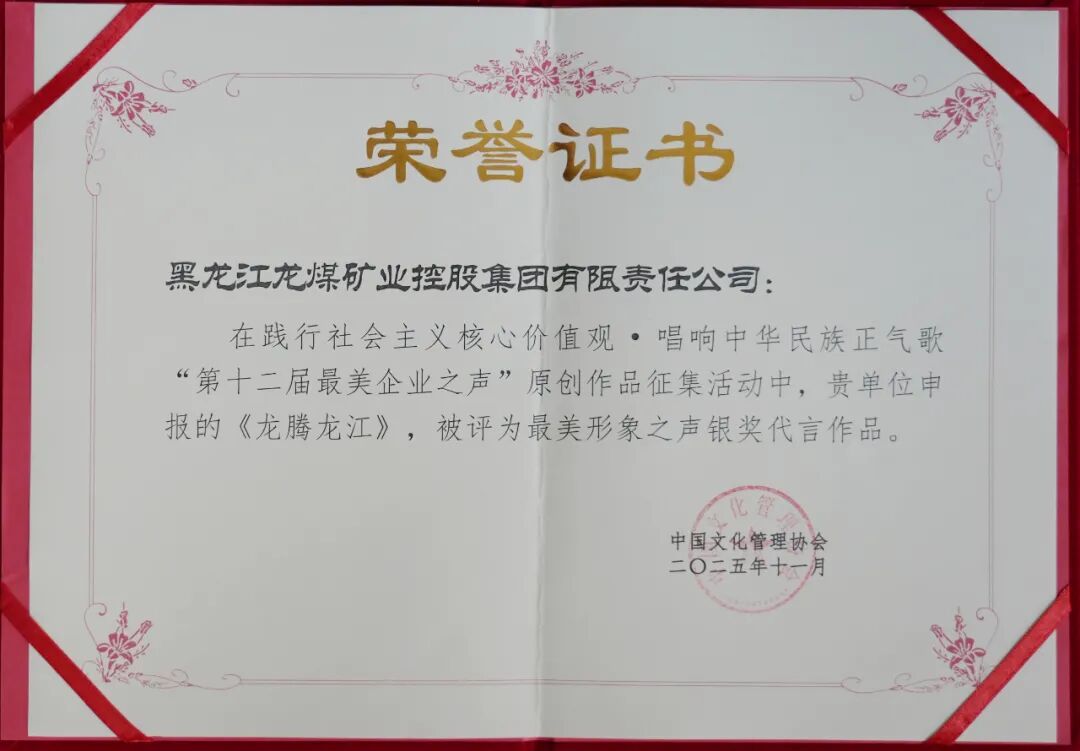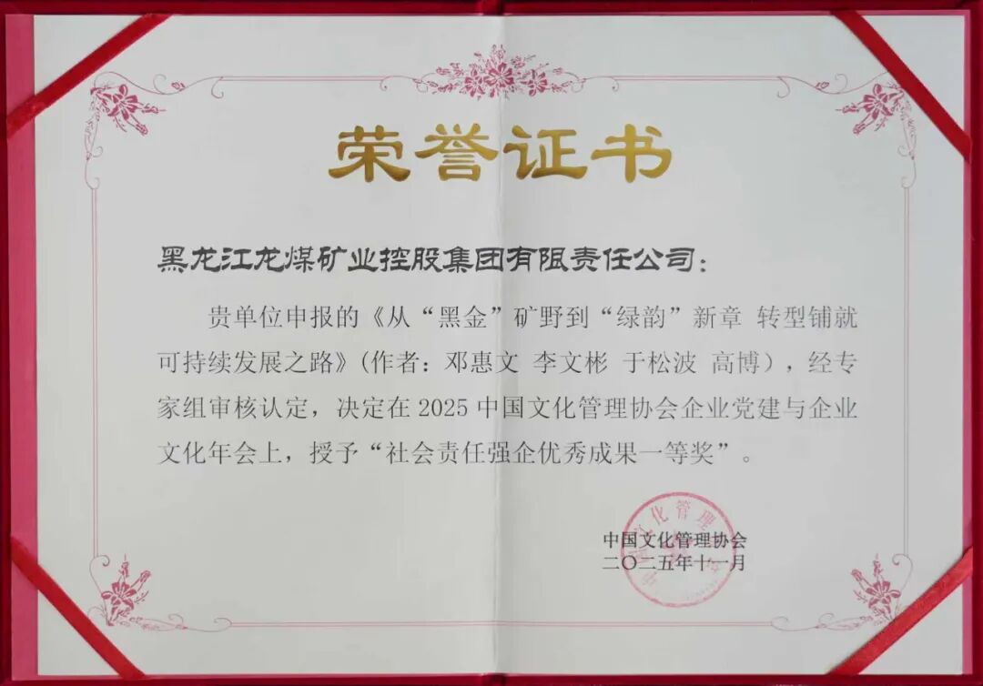由黑龙江龙煤集团申报的《从“黑金”矿野到“绿韵”新章 转型铺就可持续发展之路》被评为社会责任强企优秀成果一等奖,原创作品《龙腾龙江》《铭记烽火岁月 赓续精神火种》分获最美企业之声展演银奖作品。此外,龙煤集团还荣获“2025年度新时代企业文化建设五星单位”“2025年度优秀组织单位”等多项殊荣。