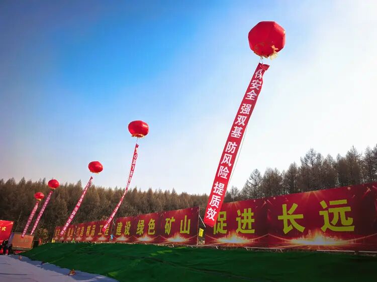 开工仪式当天,现场人头攒动,公司干部职工代表,怀着激动与期盼的心情,共同见证这一重要时刻。会场经过精心的布置,进山道路两侧的彩旗迎风招展,仿佛在向每一位来宾致意。主会场显得格外庄严,象征着企业发展的广阔前景。会场周围,10个巨大的空飘球随风舞动,悬挂着“奋力谱写现代化新鸡矿高质量发展新篇章”“煤海新舟扬帆起 赤诚奋进建新功”“保安全 强双基 防风险 提质效”等振奋人心的标语。主席台上,LED显示屏循环播放着《远航》企业发展宣传片,展示着公司的发展历程和合作煤矿的规划蓝图,将这片沉睡的土地与未来的辉煌紧紧相连。